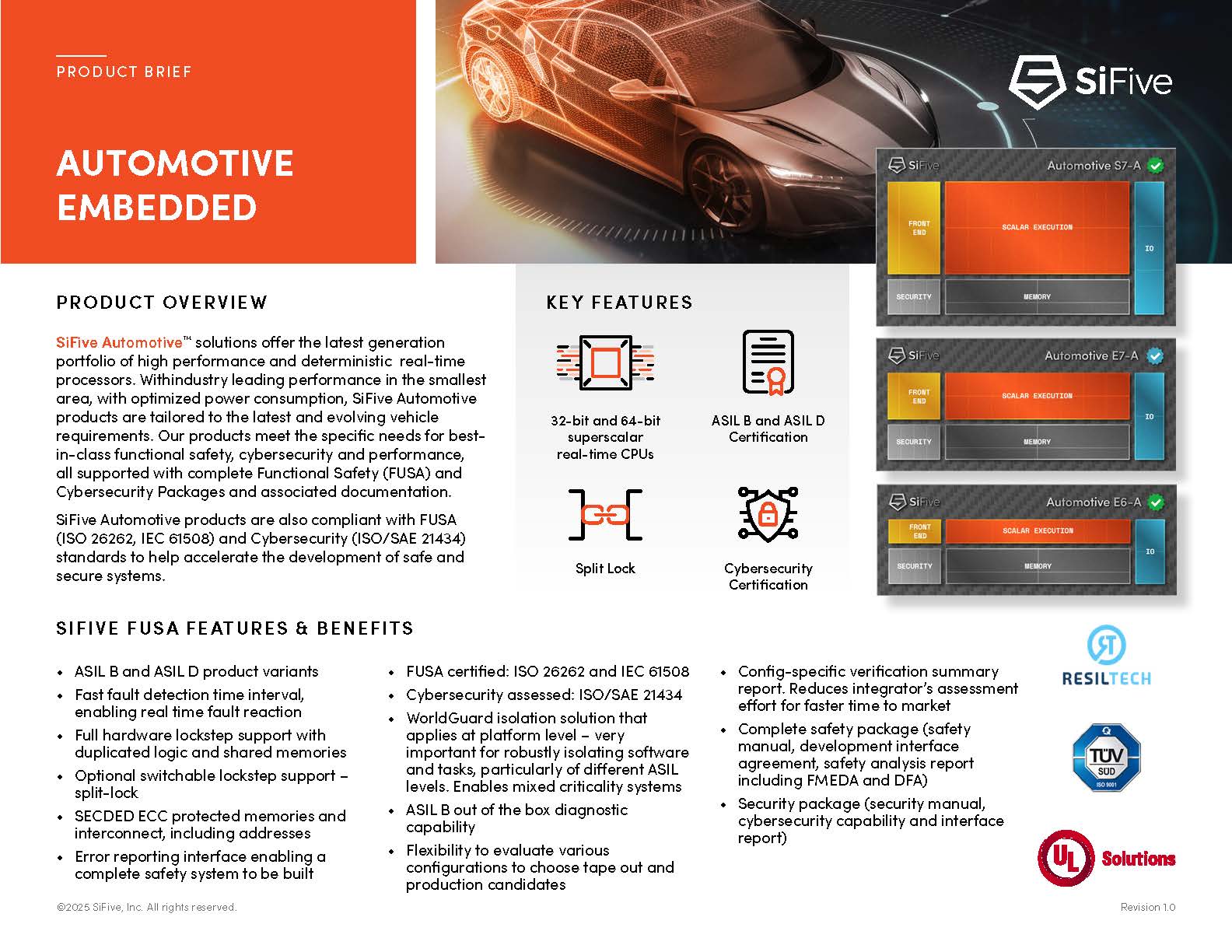 SiFive Automotive 产品亦符合 ISO/SAE 21434:2021(汽车网络安全标准),帮助 OEM 厂商满足全球法规要求,包括 UNECE WP.29 R155。